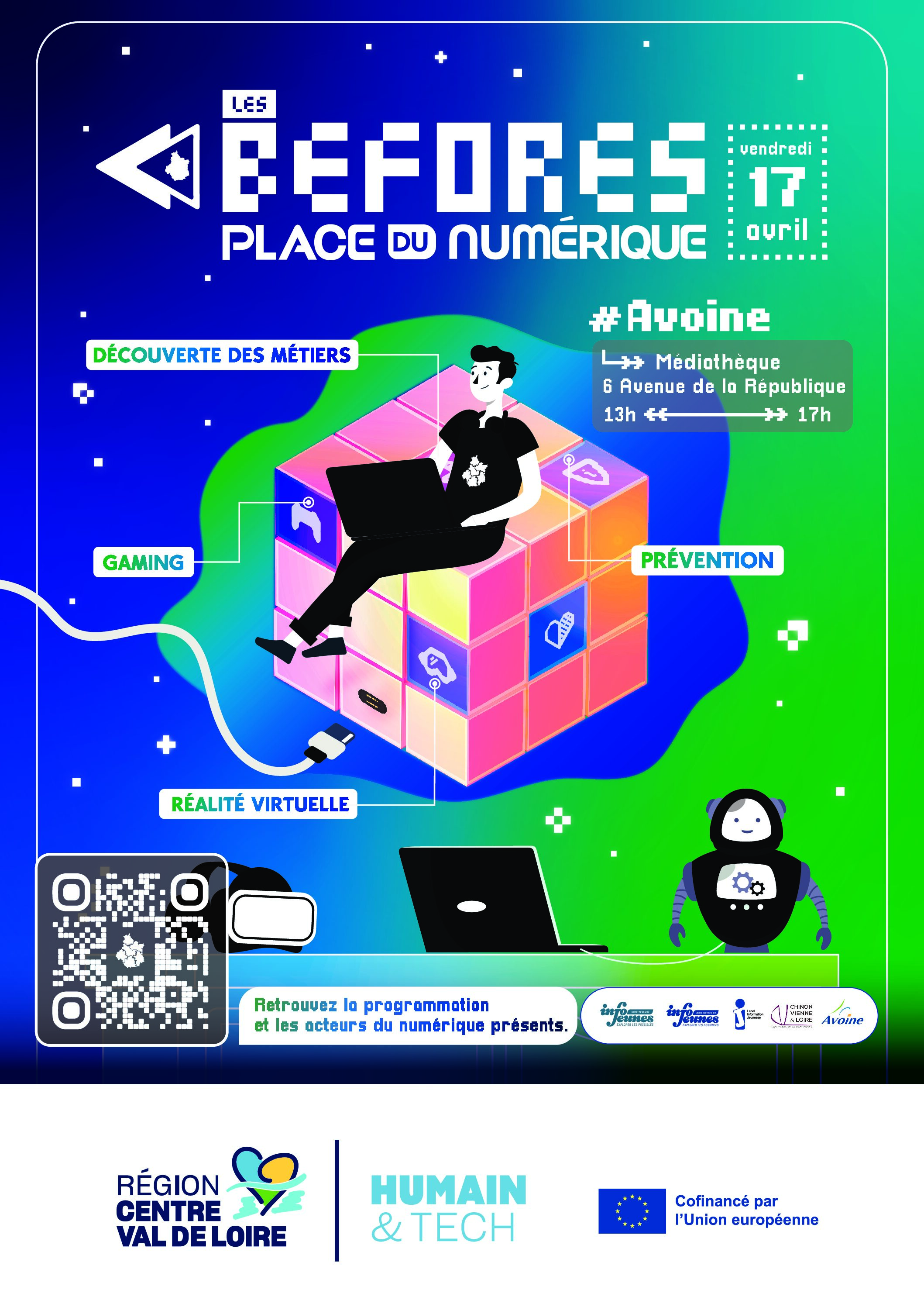 En prélude à l’évènement Place du numérique qui se tiendra à Tours le jeudi 28 mai, une date BEFORE est proposée le vendredi 17 avril de 13h à 17h à la médiathèque d’Avoine, en partenariat avec le structure Info Jeunes – Centre Social du Véron à Avoine.