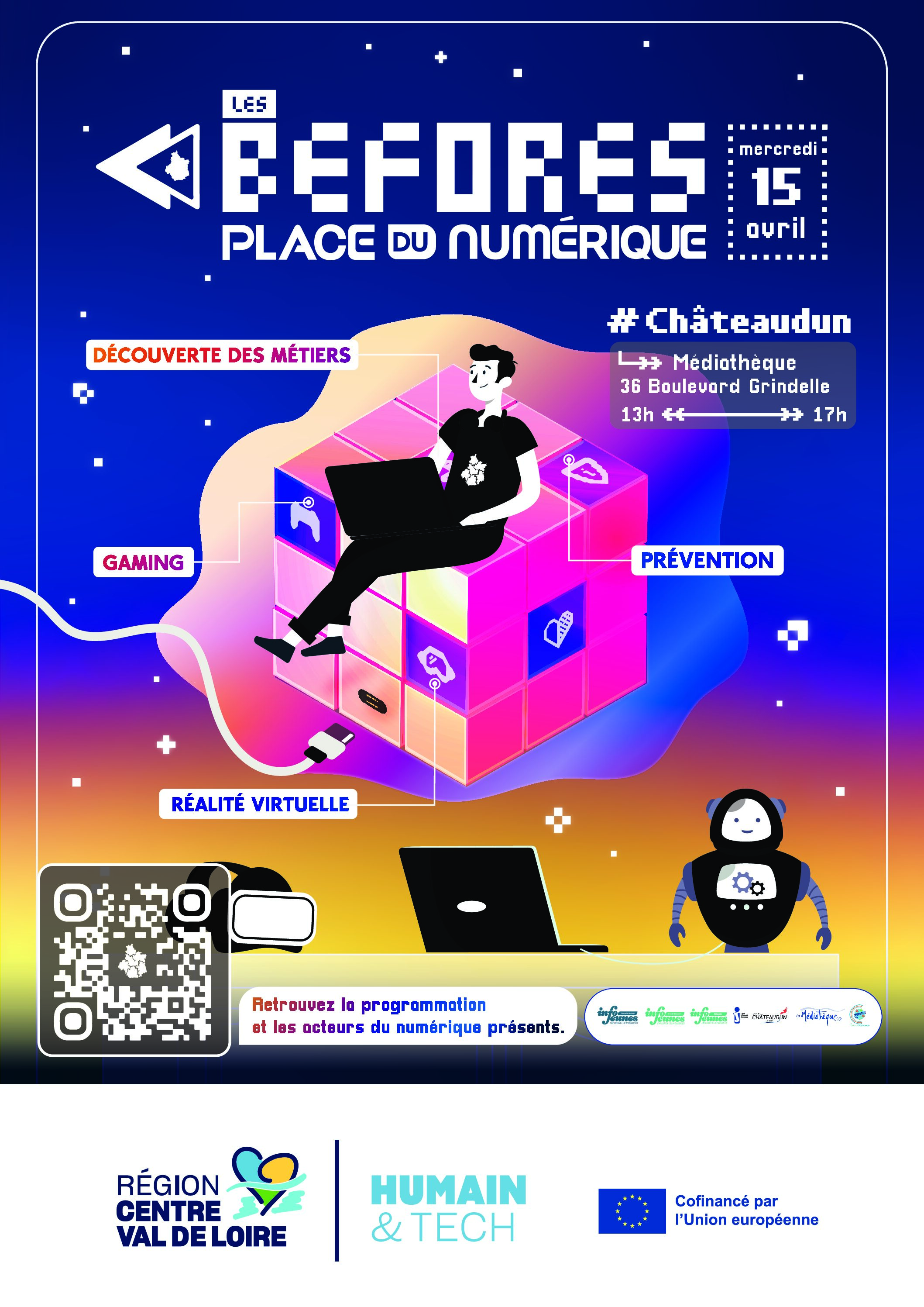 En prélude à l’évènement Place du numérique qui se tiendra à Chartres le mardi 19 mai, une date BEFORE est proposée le mercredi 15 avril, de 13h à 17h à la médiathèque de Châteaudun, en partenariat avec la structure Info Jeunes de Châteaudun.