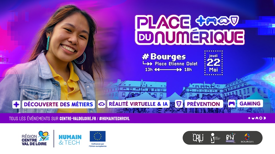 Place du numérique est organisé par le Bureau Information Jeunesse de Bourges, le CRIJ Centre-Val de Loire, et la Région Centre-Val de Loire, dans le cadre de Humain & Tech. Cette action est cofinancée par la Région Centre-Val de Loire et l’Union européenne.