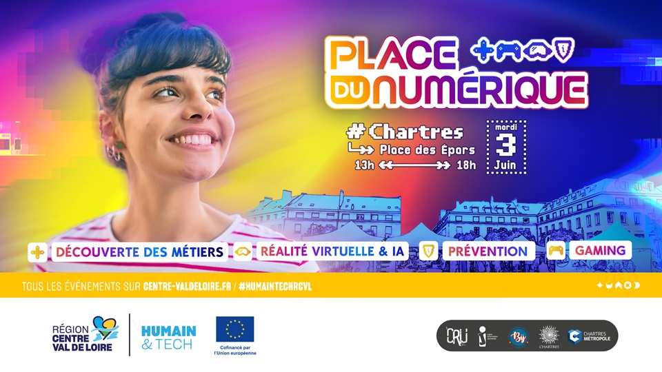 Place du numérique est organisé par le Bureau Information Jeunesse de Chartres, le tiers-lieu jeunesse & Maison des Etudiants de Chartres, le CRIJ Centre-Val de Loire, et la Région Centre-Val de Loire, dans le cadre de Humain & Tech. Cette action est cofinancée par la Région Centre-Val de Loire et l’Union européenne.